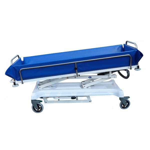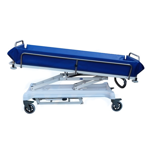 mit der präzise die Duschwanne mit dem Patienten von 50cm bis 90cm stufenlos verstellt werden kann.