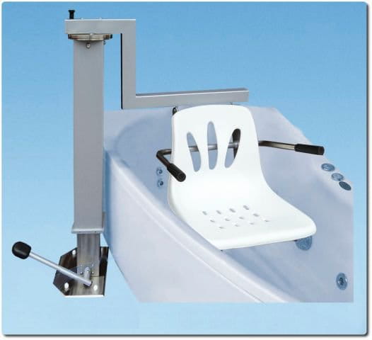 die Behinderte Person ohne große Mühe vom Rollstuhlsitz in dem Sitz des Badewannenlift gelangen. Bei Betätigung der Fuß-Hydraulik kann der Lift jetzt