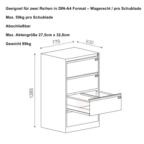 Schublade für zwei Reihen Hängeregister. Maximale Dokumentenablage: 275 x 328 mm.
