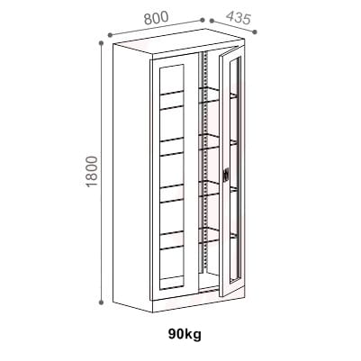 Die Schranktüren sind verglast, die Einlegeböden sind im 25-mm-Raster verstellbar.