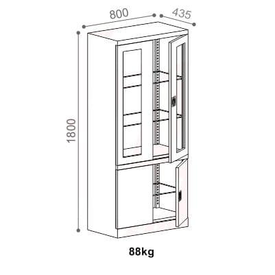 Die Schranktüren sind verglast, die Glasböden sind im 25-mm-Raster verstellbar.